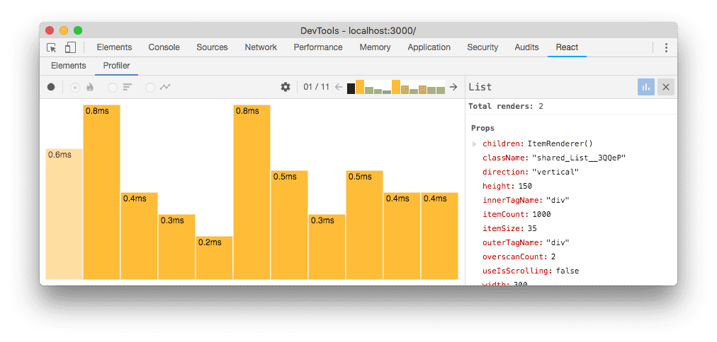 The chart above shows that the List component rendered 11 times. It also shows that each time it rendered, it was the most “expensive” component in the commit (meaning that it took the longest).